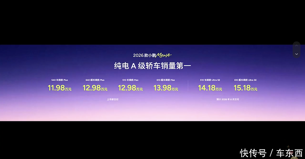 车东西4月2日消息,就在刚刚,小鹏2026款MONA M03正式上市,该车共有六个版本,价格区间为11.98万元-15.18万元,相较老款起售价不变,其中Plus版本和Max版本会优先排产,Ultra SE版本预计8月交付。